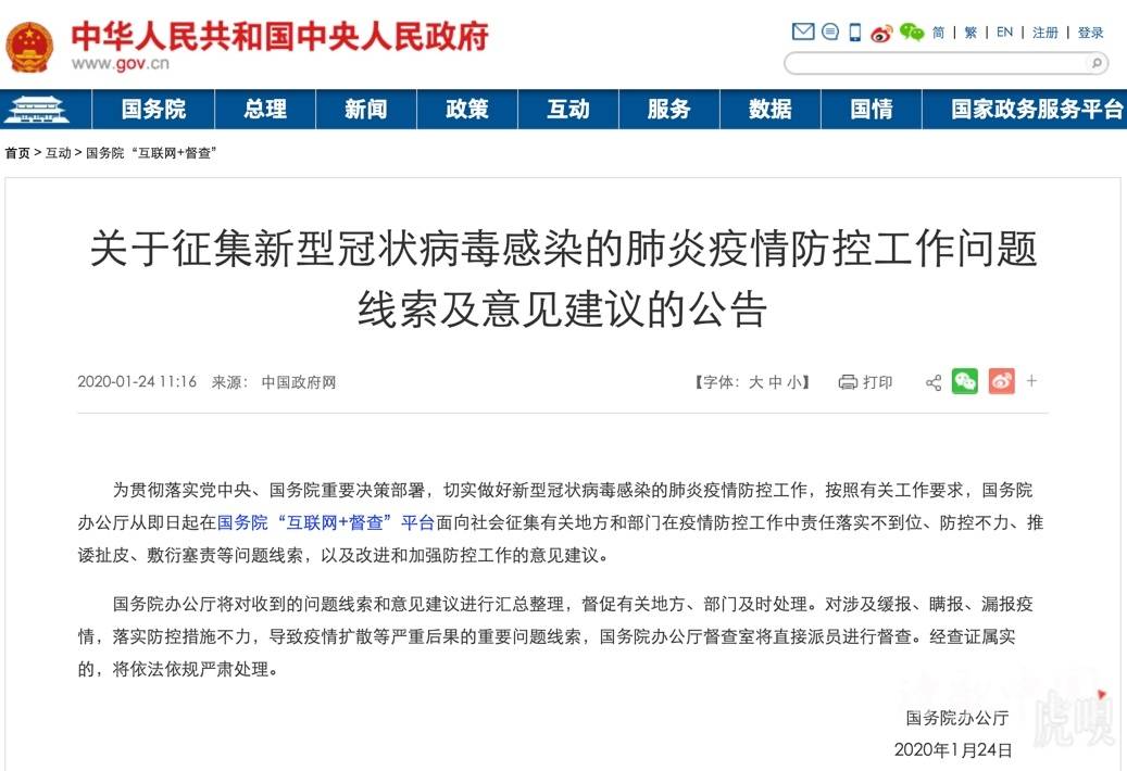 中国政府网网站1月24日消息,为贯彻落实党中央、国务院重要决策部署,切实做好新型冠状病毒感染的肺炎疫情防控工作,按照有关工作要求,国务院办公厅从即日起在国务院“互联网+督查”平台面向社会征集有关地方和部门在疫情防控工作中责任落实不到位、防控不力、推诿扯皮、敷衍塞责等问题线索,以及改进和加强防控工作的意见建议。