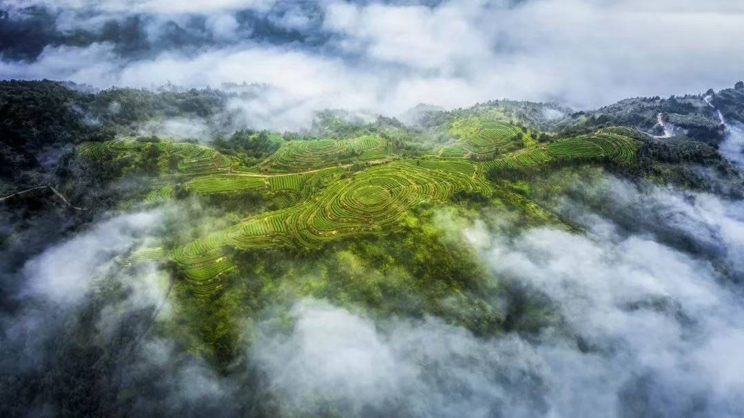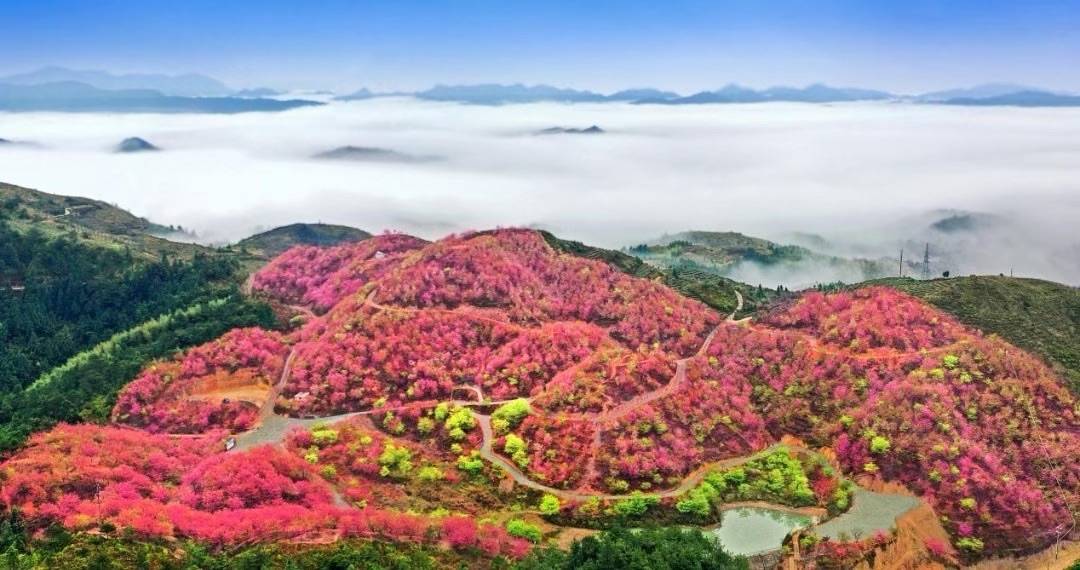 樱花紫袖临仙境,雾海茶山醉我心。