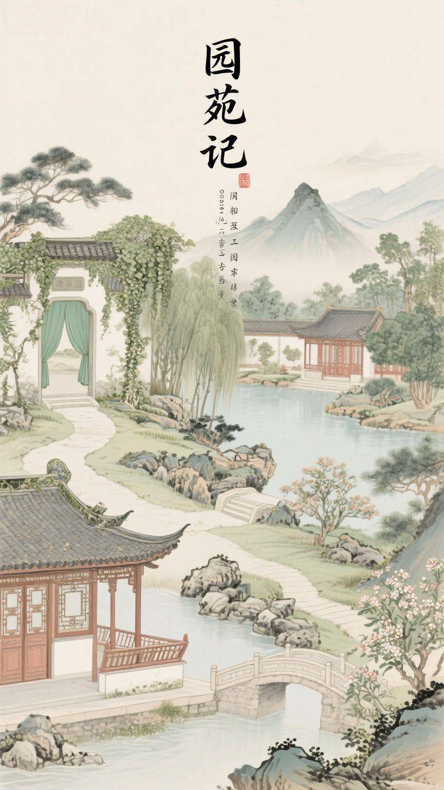 园门初入,翠帷迎迓。苔纹蚀槛,萝蔓交萦,微径蜿蜒,潜通幽阃。全园形分五位,景敞四隅。远岫含黛,松坪展碧,修篁环渚,曲水浮烟。池阔涵天,林深藏鹿。