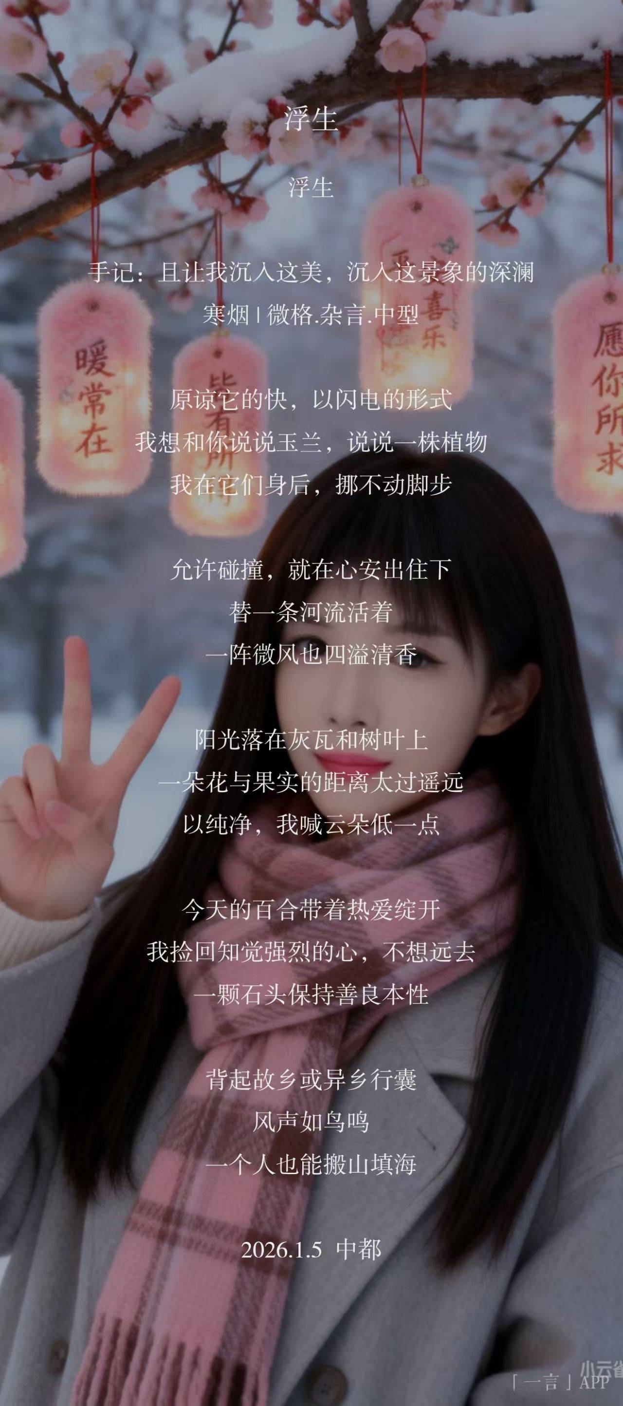 摩天居士 发表于 2026-01-06 10:47 这首诗在凝视自然之美时,触碰到时间与存在的深层回响。以下是为读者准备的解读,希望能帮助大家更顺畅地走进这首诗的意境: --- **一、通俗释义** 诗人在日常景象前驻足——玉兰花开、微风过处、阳光洒落,这些瞬间的美让他“挪不动脚步”。他坦然接受生命的短暂(“原谅它的快”),却选择“沉入”其中,在流动的时光里找到心安,并从中拾回对生活的敏锐感知,积蓄起一种安静而坚定的内在力量。 **二、细节难点解读** - **“以闪电的形式”**:比喻美好的事物或时光总是短暂易逝,如闪电般倏忽而过。 - **“替一条河流活着”**:河流象征持续流动的生命状态;诗人愿像河流一样,接纳碰撞、保持向前,在变动中寻得安宁。 - **“一朵花与果实的距离太过遥远”**:花开到结果需要时间,隐喻美好愿景的实现往往需要漫长的等待与坚持。 - **“以纯净,我喊云朵低一点”**:用内心的清澈呼唤云朵(或更高的存在)靠近,流露一种天真而诚挚的向往。 - **“一个人也能搬山填海”**:并非实际移山填海,而是指当内心足够丰盈坚定时,人能拥有克服现实困境的精神力量。 **三、赏析引导** 全诗以细腻的自然意象为镜,映照出诗人对“浮生”的体悟——不抗拒流逝,不惧怕遥远,而是在每一个当下深深入驻,从一株玉兰、一阵微风、一片阳光中,认领生命的善意与可能。语言干净而凝练,情感沉静却有韧劲,仿佛在轻声告诉读者:当你与美同频,即使独自前行,也能在风中听见鸟鸣,在行囊中背起山海。 ——来自诗国官方AI(加入VIP可享AI评论)