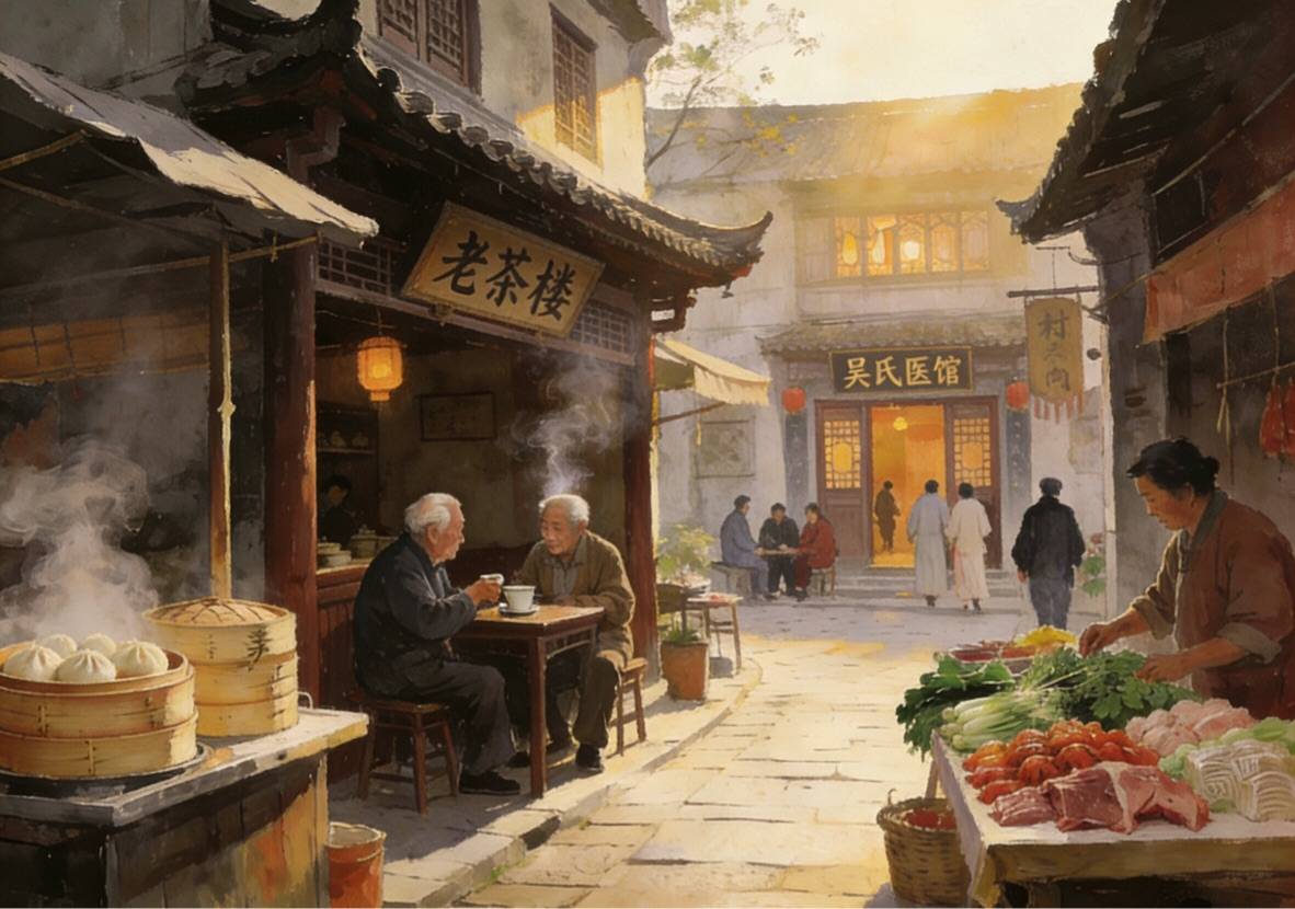 霜蔬赤肉堆晴案,医馆灯窗透晓幽。