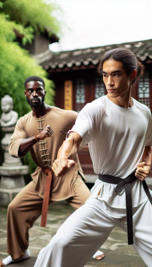 图片中两位人物正在练习武术动作,其中一人身着白色练功服,另一人穿着棕色练功服,两人的姿势显示出他们正在进行严谨的武术训练。这与诗中的描述相呼应,展示了咏春拳作为一种武术的实际场景和力量之美。