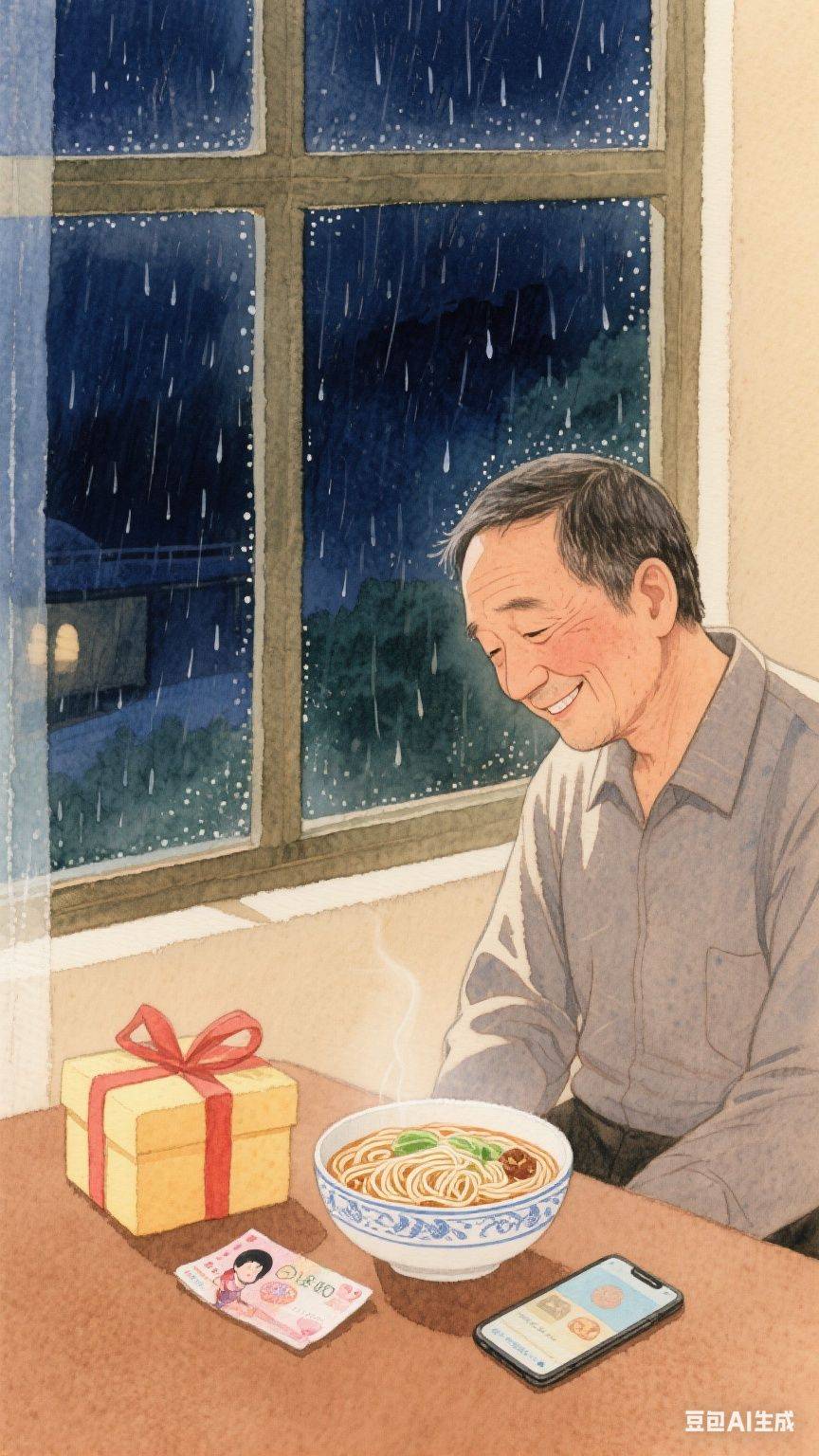 儿送面条汤尚温,女传吉款暖心魂。谁知廿载为严父,今日初尝礼馈恩。