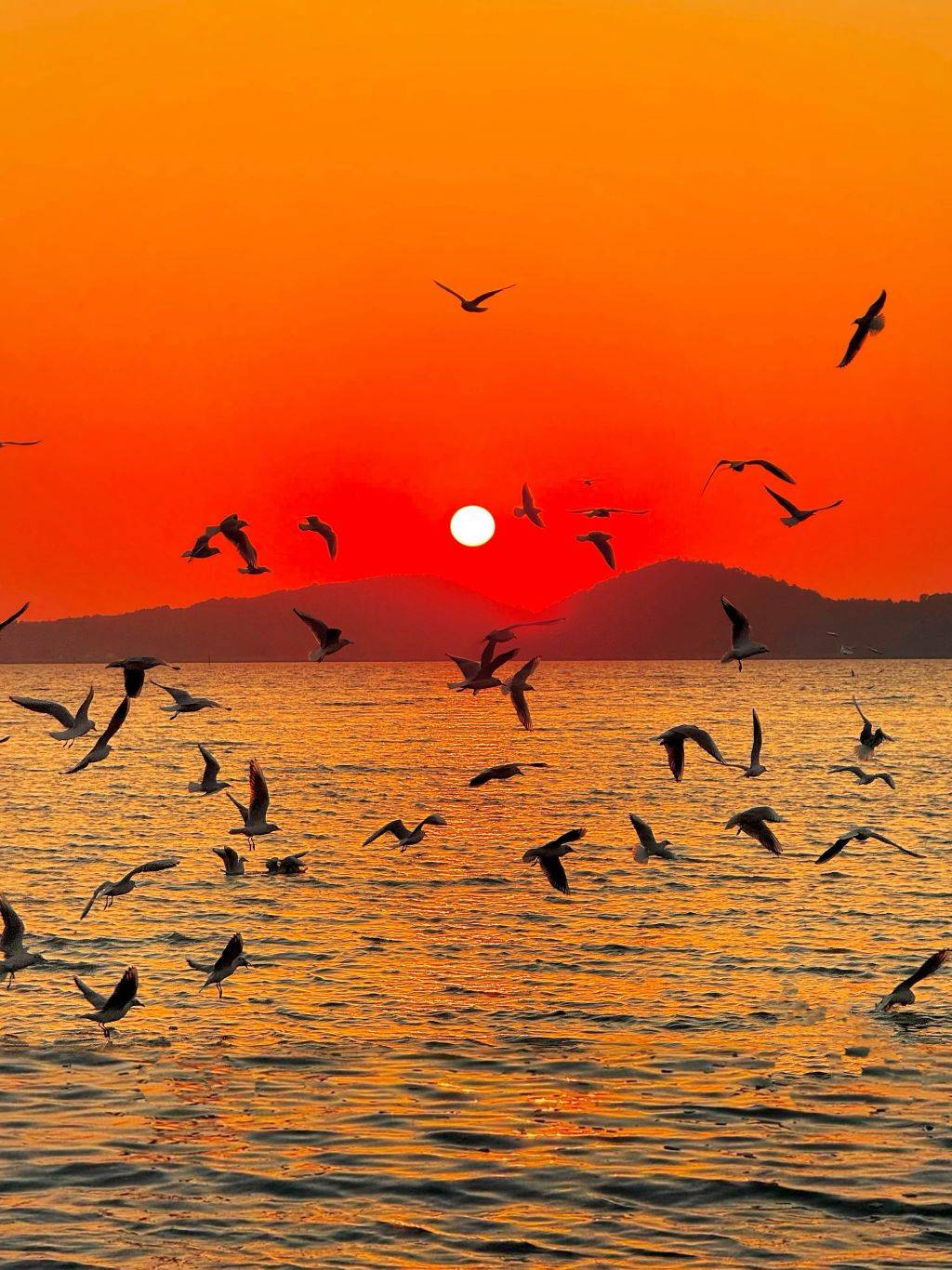 山衔落日湖光碎,夕影沉波万点鸥。