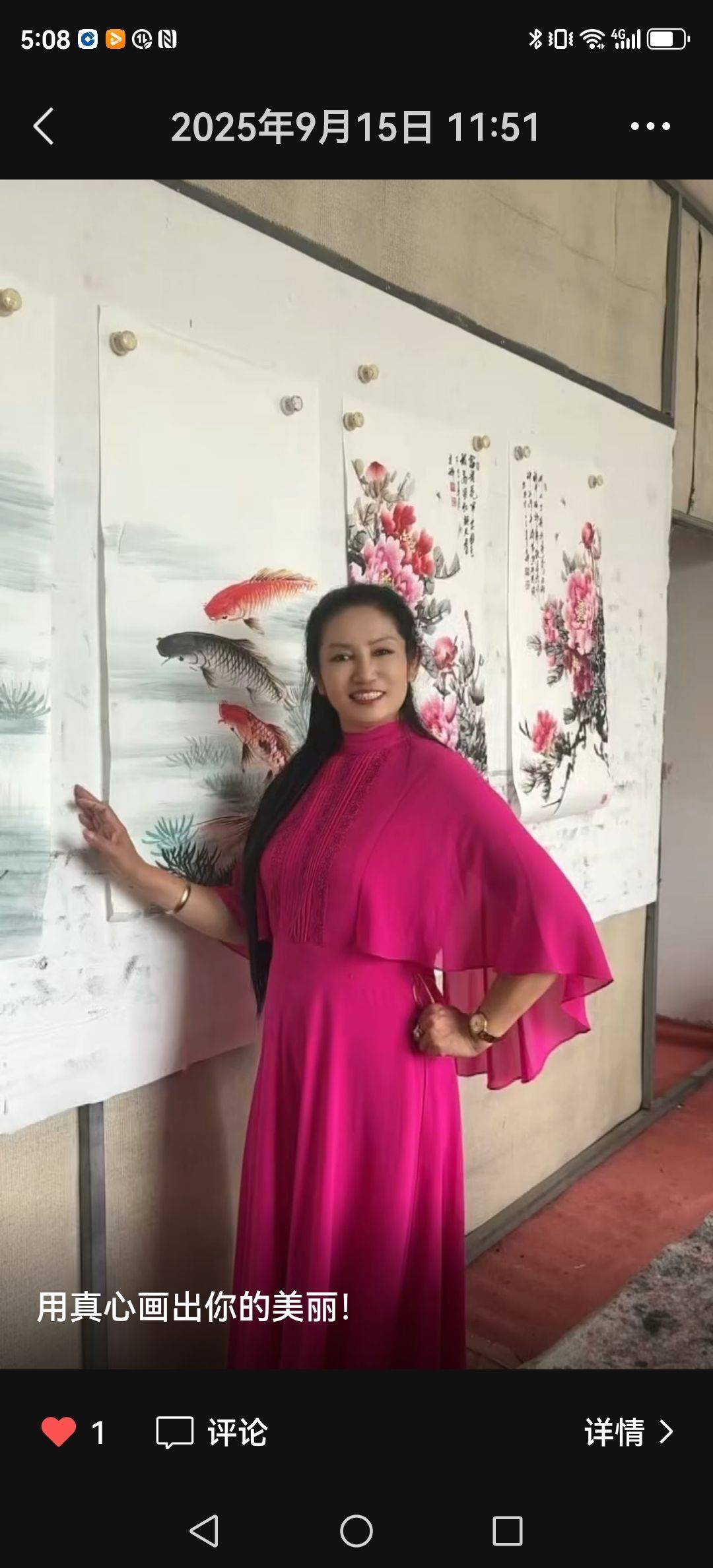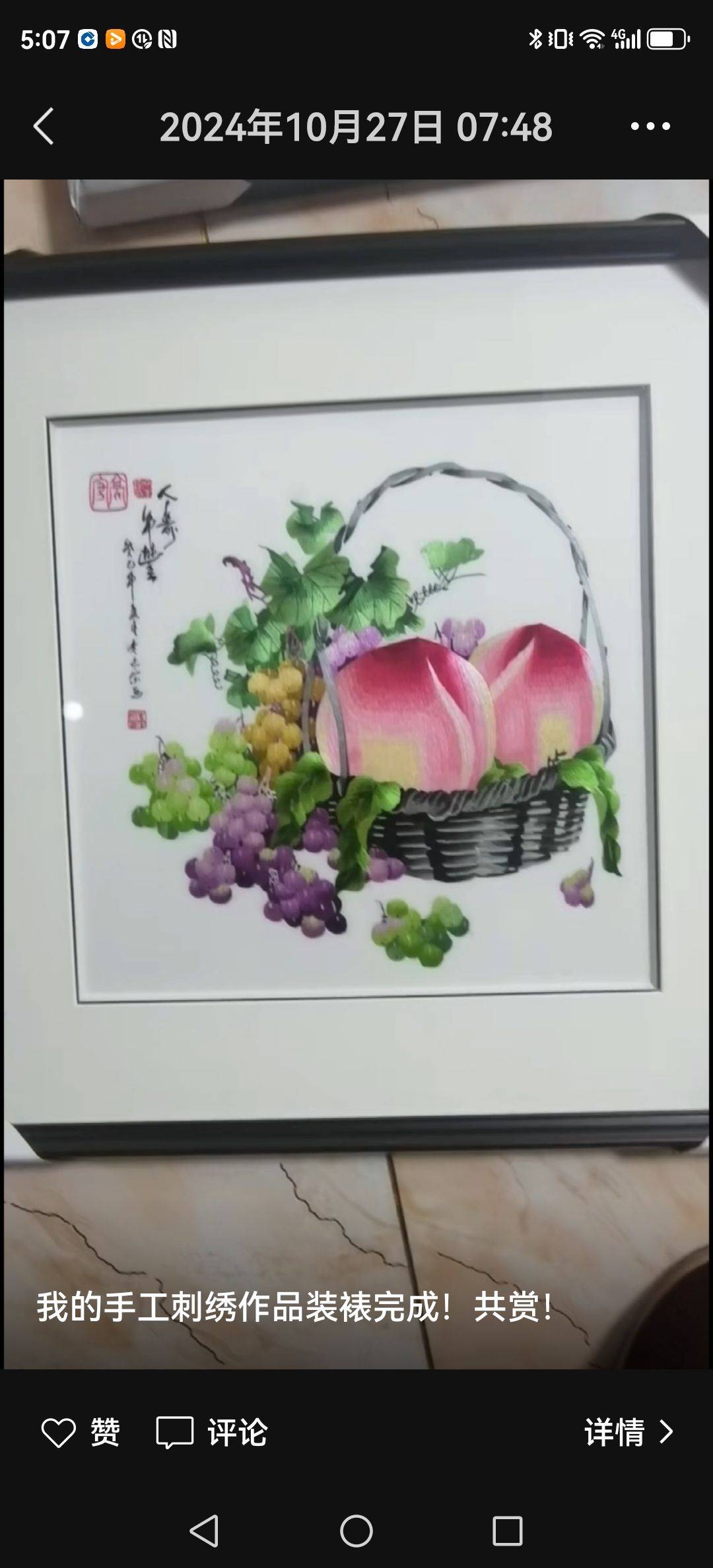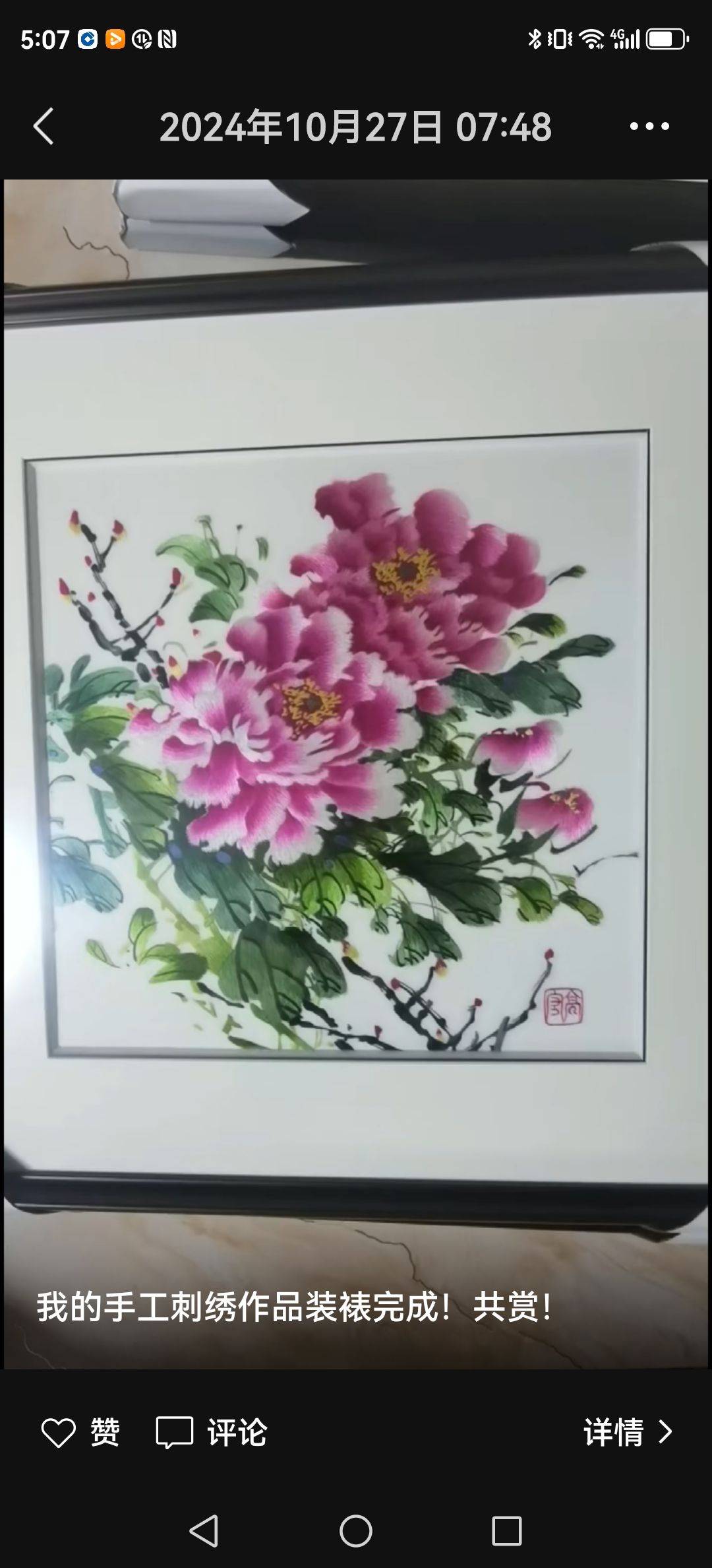 (配图中可见乌兰女士的刺绣作品针脚细密,牡丹富丽堂皇,锦鲤栩栩如生,与诗中描绘相得益彰)