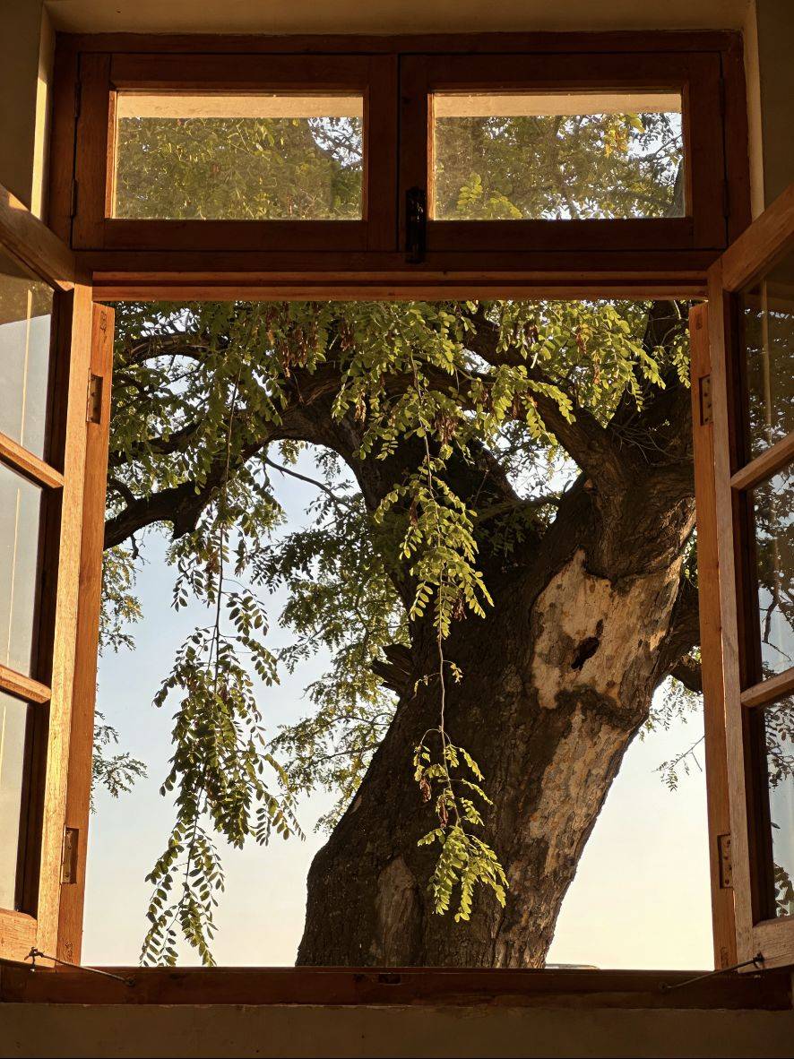 我的窗户正对着一棵老槐树。